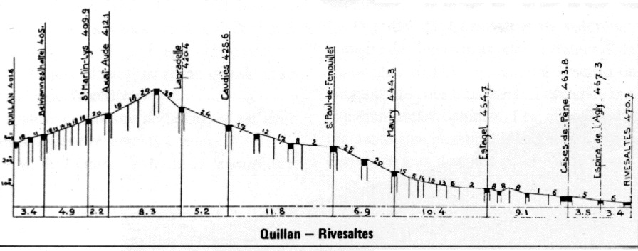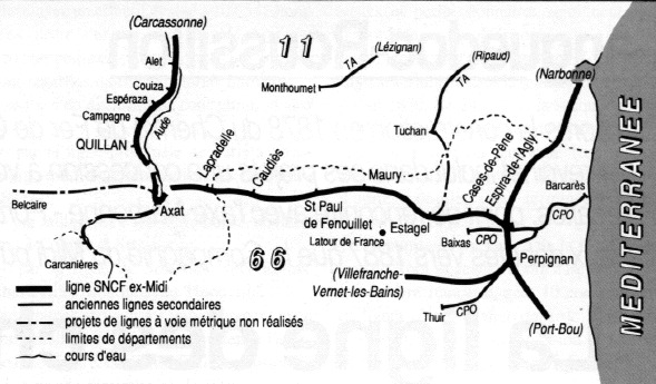 Longue de 69 km, la ligne de Rivesaltes à Quillan fut ouverte le 14 juillet 1901 jusqu'à St Paul-de-Fenouillet, et en totalité le 25 avril 1904.