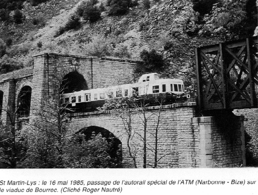 Ne nous attardons pas, car dès Axat, le chemin de fer vas jouer à cache-cache avec l'Aude et les routes par une série d'ouvrages d'art qui coupent la vallée. Dans une trouée de la gorge, voici la gare isolée de Saint-Martin-Lys aux portes de ce défilé. Un bel échantillon de ponts et tunnels s'ensuit rapidement, vivant témoignage du travail titanesque de ces hommes qui à l'aube de ce siècle, ont contribué à cette "belle ouvrage".
